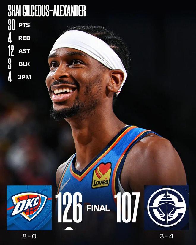 SGA30+12哈登25分 雷霆胜快船开季8连胜