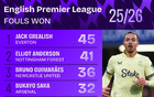 本赛季英超被犯规榜:格拉利什45次第一、萨卡32次第四